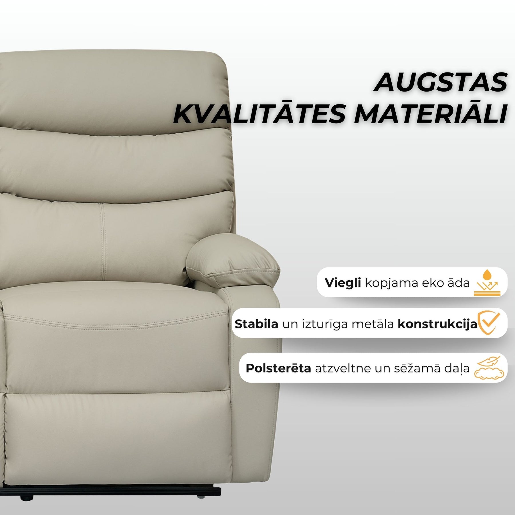 Atpūtas krēsls pārklāts ar premium klases eko ādu, kas izceļas ar izcilu mīkstumu, patīkamu tekstūru un ilgmūžību. Materiāls ir viegli kopjams un izturīgs pret ikdienas nodilumu, saglabājot nevainojamu izskatu gadiem ilgi.
