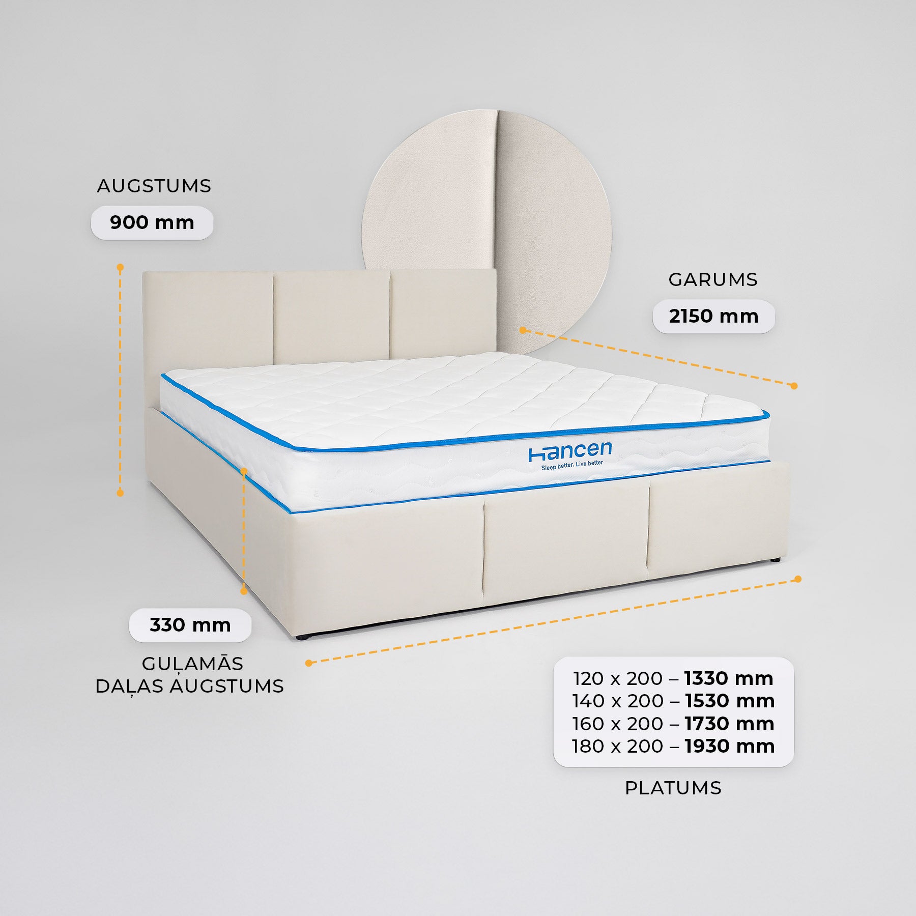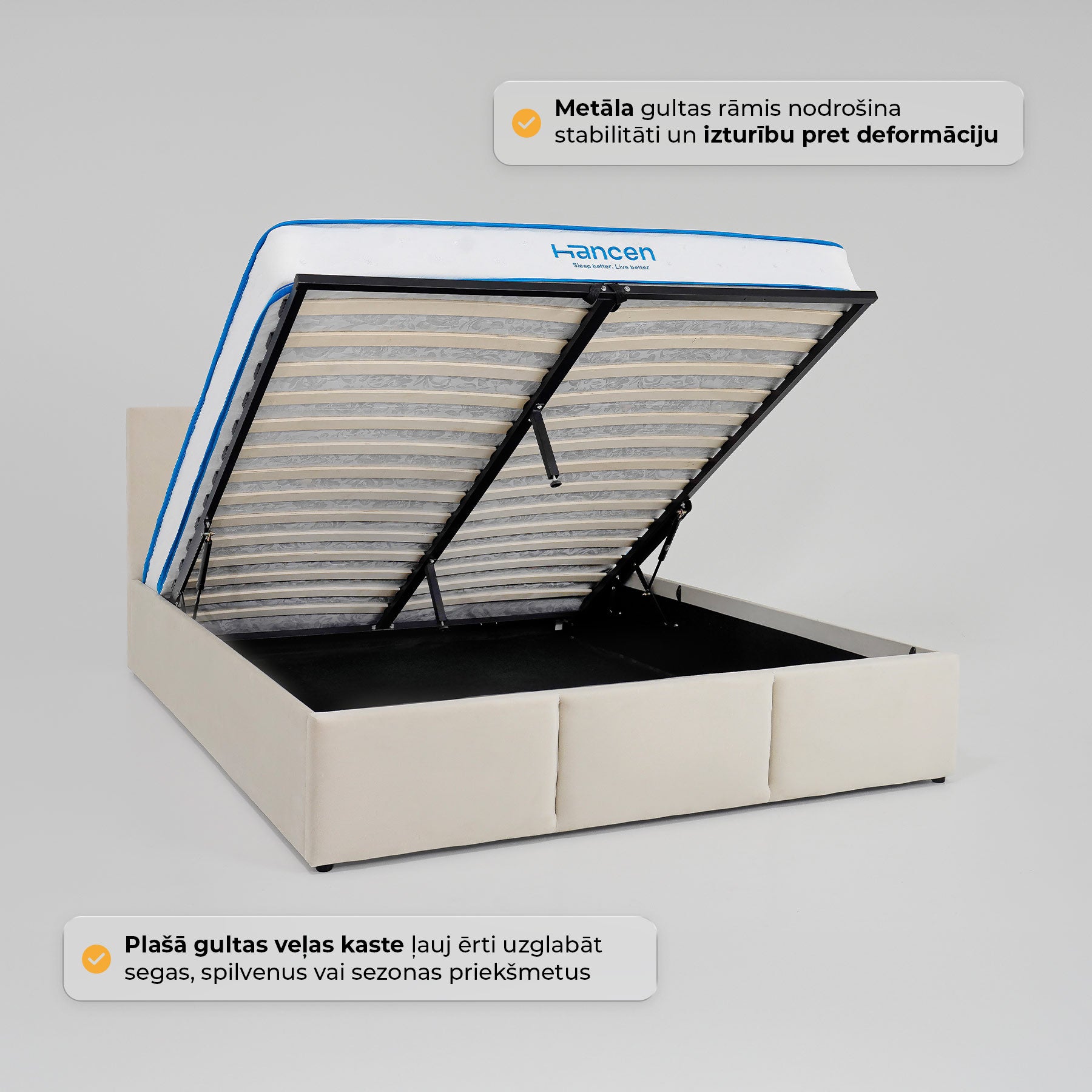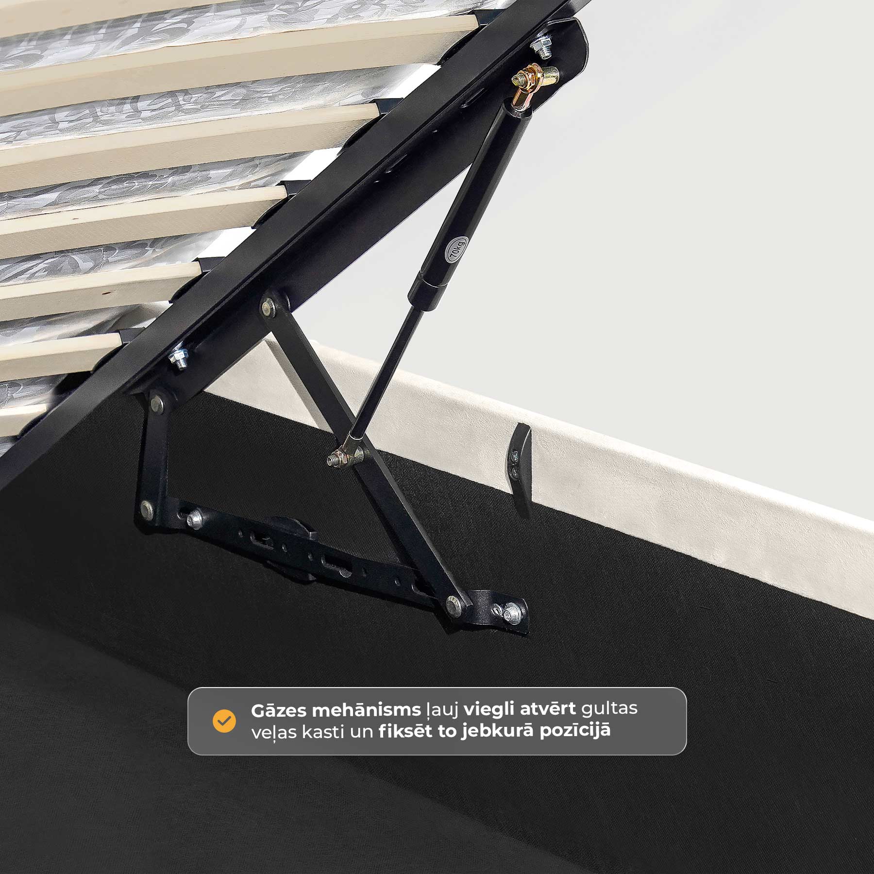 Gulta Tops ir ideāls komforta, stila un funkcionalitātes apvienojums. Tās minimālistiskais dizains un kvalitatīvais velūra audums piešķir šai gultai eleganci un greznību, kas padarīs to par jūsu guļamistabas akcentu. Gulta ir aprīkota ar praktisku pacelšanas mehānismu un ietilpīgu gultas veļas kasti, kas nodrošinās kārtību un efektīvu telpas izmantošanu. Gultas izturību un ērtu izmantošanu garantē metāla redeļu rāmis un izturīgie gāzes amortizatori. Ar gultu Tops jūs ne tikai izbaudīsiet lielisku atpūtu, bet arī radīsiet modernu un omulīgu atmosfēru savā mājoklī.