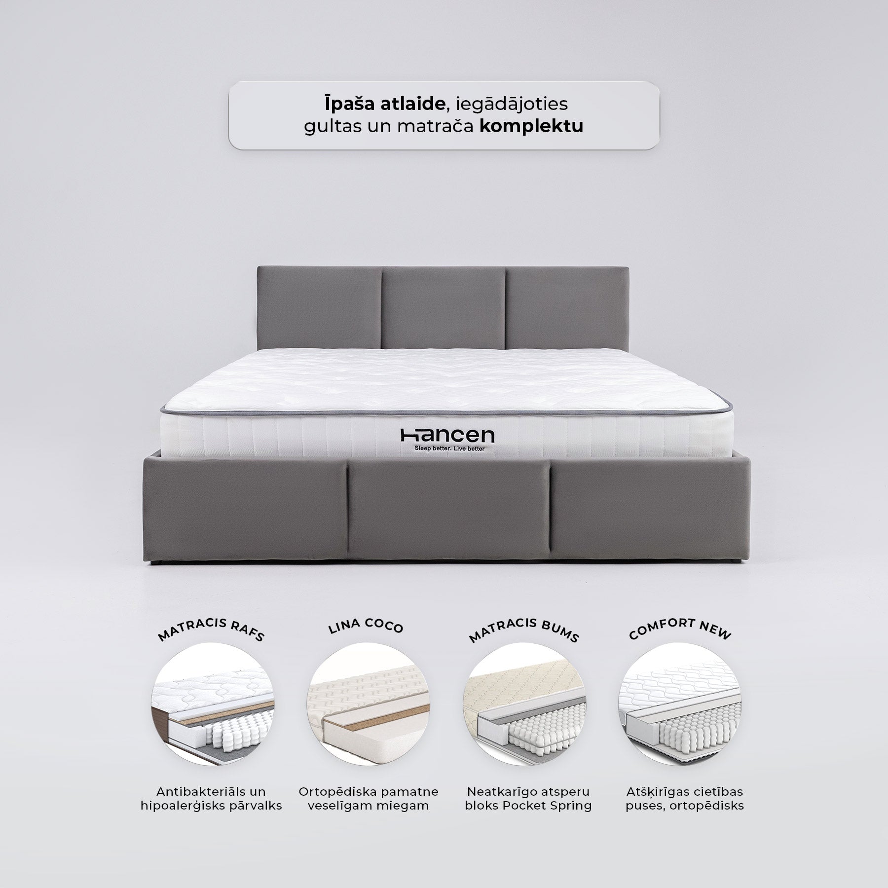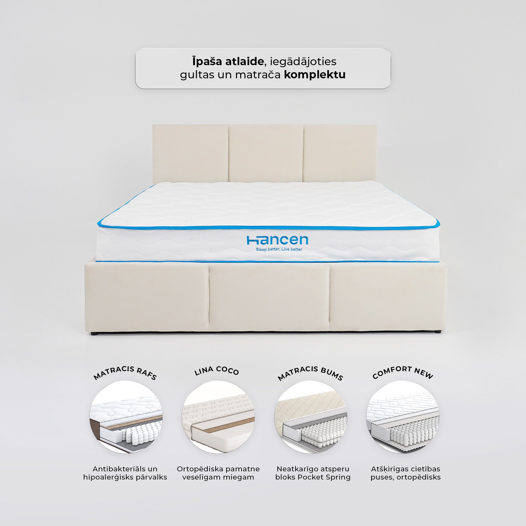 Пружинный матрас среднего класса высотой 18 см. Матрас с карманными пружинами (Pocket), которые полностью изолируют внешнее трение и устраняют любые звуки взаимодействия пружин. Этот матрас имеет вязкоупругий слой, который адаптируется к телу. Матрас средней жесткости с одной стороны и жесткий с другой. Матрас Comfort имеет съемный чехол, который можно стирать. Выдерживает нагрузку до 120 кг на одно спальное место.