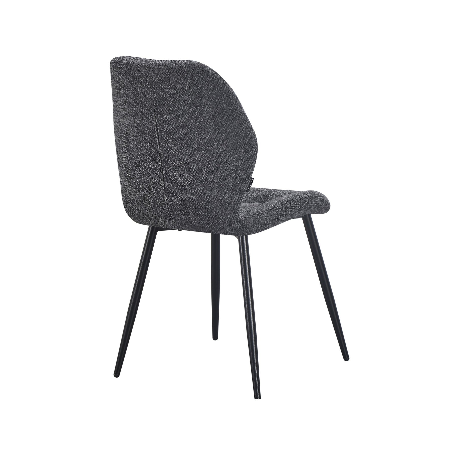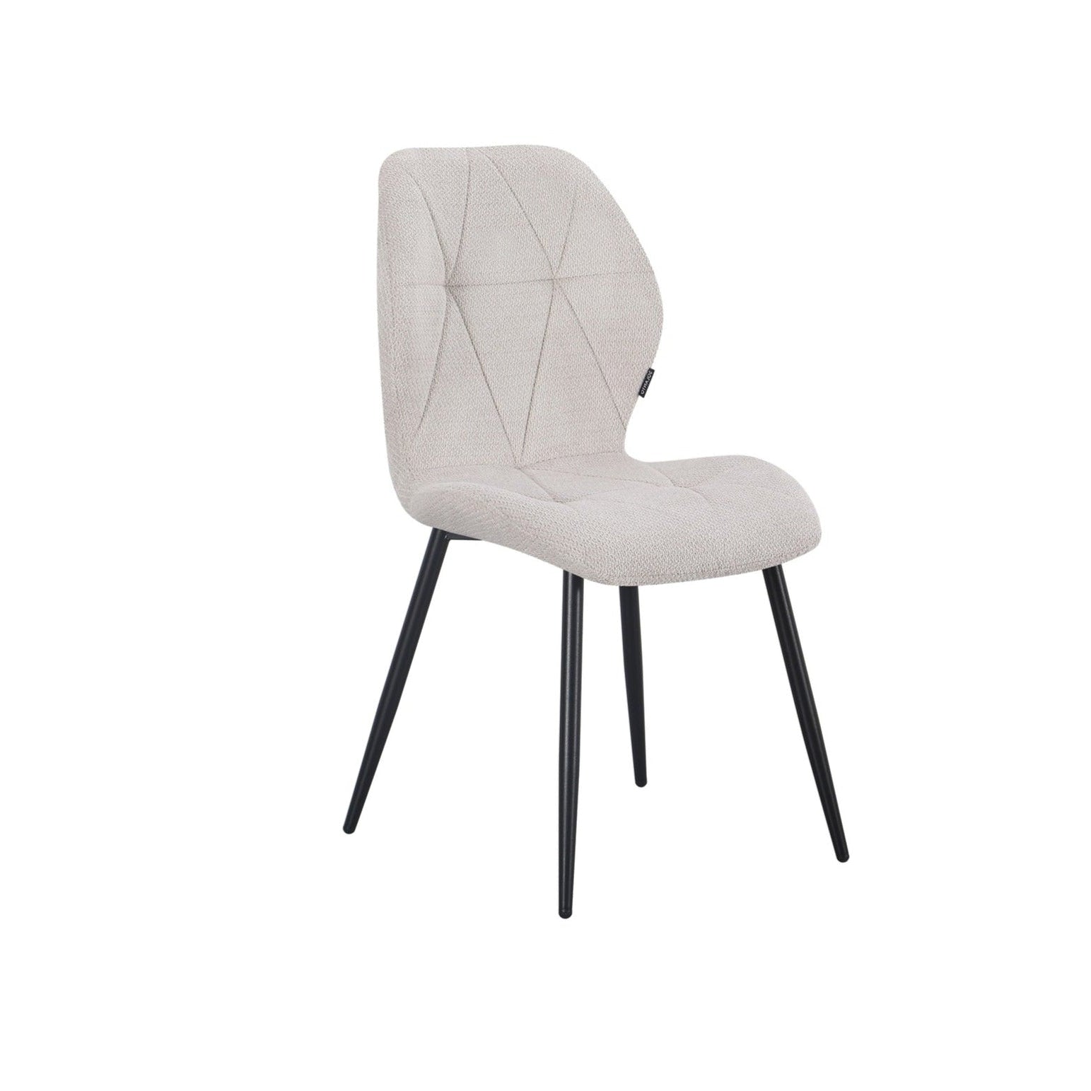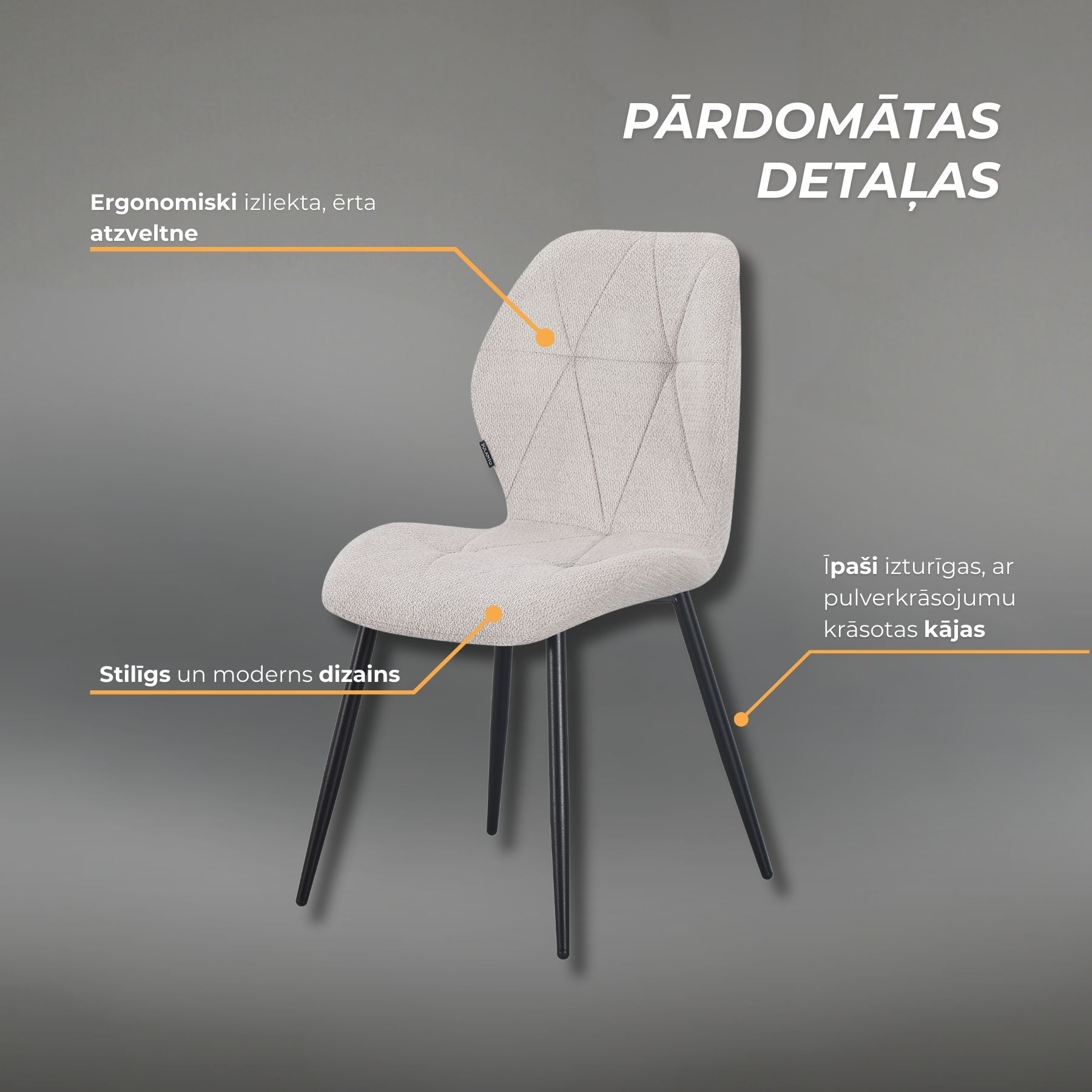 Šis krēsls izceļas ar savu ergonomiski izliekto atzveltni, kas nodrošina ērtu sēdēšanu un pareizu muguras atbalstu. Dekoratīvie izšuvumi piešķir krēslam modernu un elegantu izskatu, padarot to viegli pielāgojamu dažādiem interjera stiliem. Izturīgas ar pulverkrāsojumu krāsotas metāla kājas garantē stabilitāti un ilgstošu lietošanu.